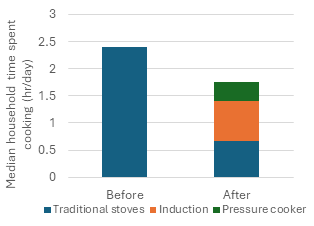 Families with no prior experience of electricity adopted e-cooking almost immediately. Within hours of being deployed, they were confidently managing the e-cooking systems, leapfrogging entire stages of the ladder (reducing the time spent using traditional cookstoves and consumption of polluting fuels by over 70% — see fig. 3).